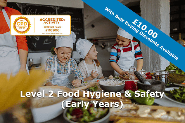 This course builds on a basic knowledge in food safety and hygiene which the student may already have, or can acquire via our Level One Food Hygiene and Safety course. Our Level Two Food Hygiene and Safety (Early Years) course is designed for those in the early years industry, such as childminders, and goes into greater depth into how to conduct activities appropriately when working with food in this sector. The course content is succinct and engaging, and candidates find the layout and use of images helpful and easy to follow. All content is in line with regulations outlined in UK food safety and hygiene legislation, and the course is fully accredited by The CPD Group. The course takes roughly 1 – 2 hours to complete and includes an examination consisting of 25 multiple choice questions. The student must pass the exam in order to receive their accredited certificate. This ensures that all certificate holders have the most up-to-date understanding of food hygiene and safety best practices to work safely with food in the UK. By completing this course and exam, candidates will have furthered their food safety education and will have demonstrated knowledge in food hygiene and safely best practice. Protect your business by giving yourself and your staff the essential knowledge in food hygiene and safety required by law, by booking this course today. Our high-quality courses are available at extremely competitive prices, and we offer discounts for bulk orders.