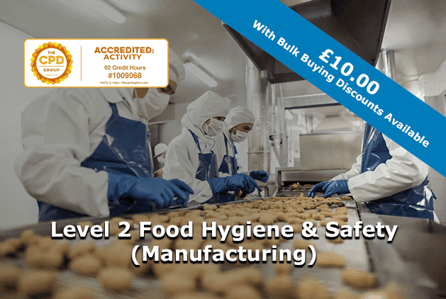 The Level Two Food Hygiene and Safety (manufacturing) course is tailored towards those in the manufacturing industry, who will need to understand how to prepare and handle food safely.
